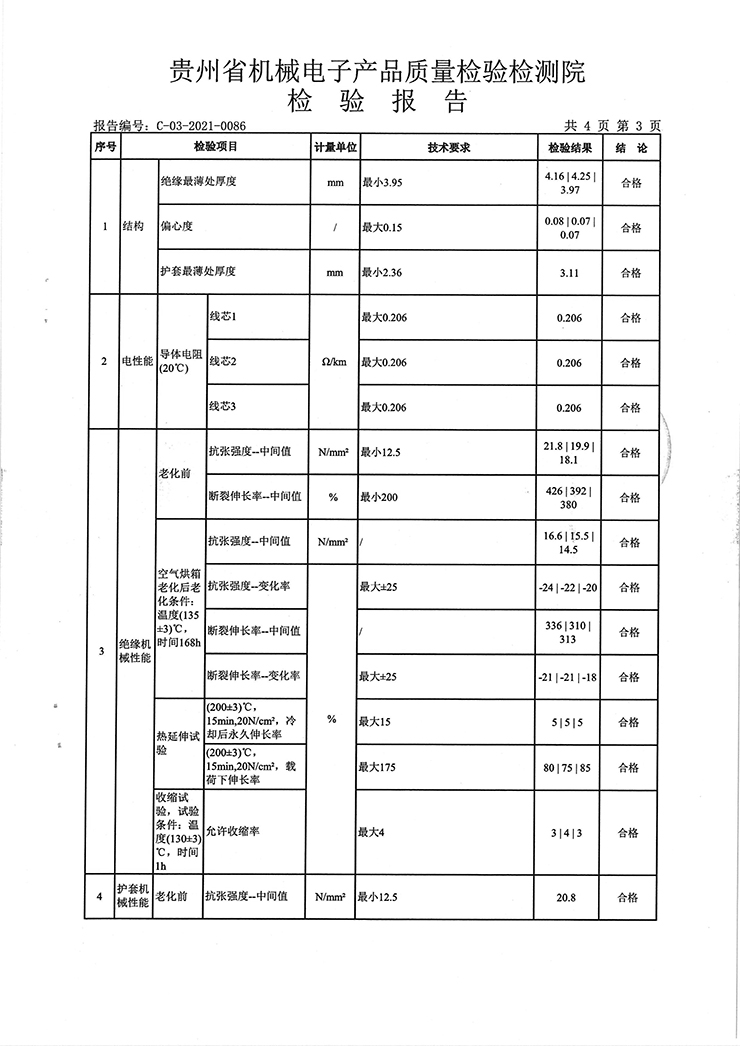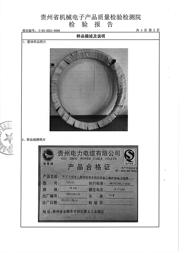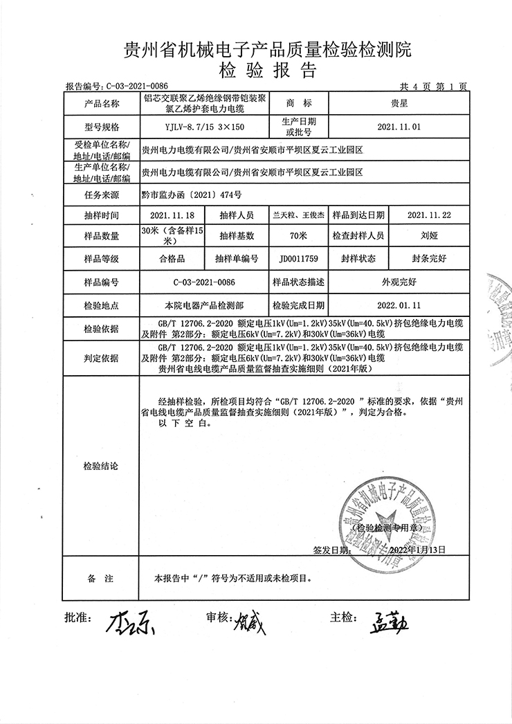 鋁芯交聯聚乙烯絕緣鋼帶鎧裝聚氯乙烯護套電力電纜 檢驗報告